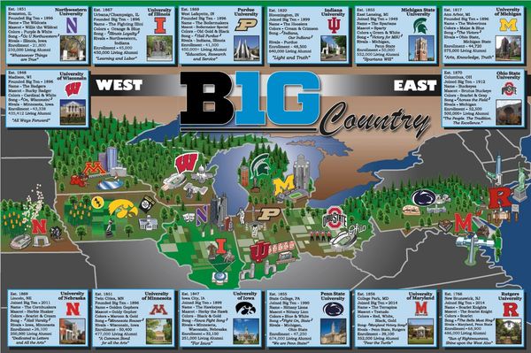 We put the Big Ten on "The Map" The Big Ten Map is a B1G, beautiful, and colorful US map (24" high x 36" wide) that vividly captures the geographic "footprint" of the Big Ten Conference from Nebraska, Minnesota and Iowa in the West spanning Eastward through the Great Lake states all the way to Penn State, Maryland, and Rutgers in New Jersey. The campuses of all 14 Big Ten universities across 11 states are displayed including their iconic logos as well as a host of "fun facts" about each school.